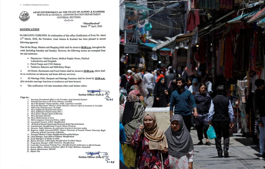 ڈیلی دومیل نیوز،حکومتِ آزاد کشمیر نے ریاست بھر میں توانائی کی بچت کے لیے بڑے فیصلے کرتے ہوئے بازاروں اور کاروباری مراکز کے اوقاتِ کار محدود کر دیے ہیں۔ سروسز اینڈ جنرل ایڈمنسٹریشن ڈیپارٹمنٹ کی جانب سے جاری کردہ تازہ ترین نوٹیفیکیشن کے مطابق صدر آزاد جموں و کشمیر نے نئے اقدامات کی منظوری دے دی ہے۔