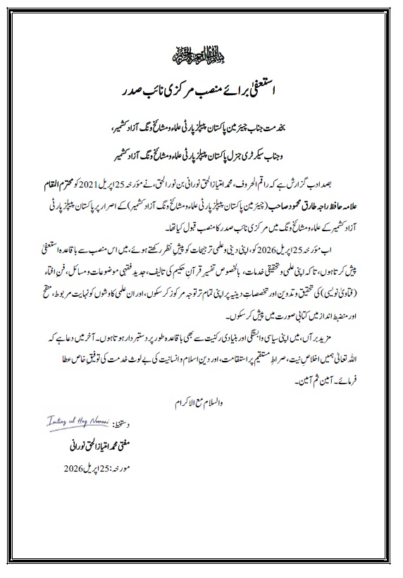 مظفرآباد (نمائندہ خصوصی): ممتاز عالم دین و مصنف ،مفتی محمد امتیازالحق نورانی نے پاکستان پیپلز پارٹی علماء و مشائخ ونگ آزاد کشمیر کے مرکزی نائب صدر کے عہدے سے استعفیٰ دے دیا ہے۔