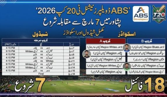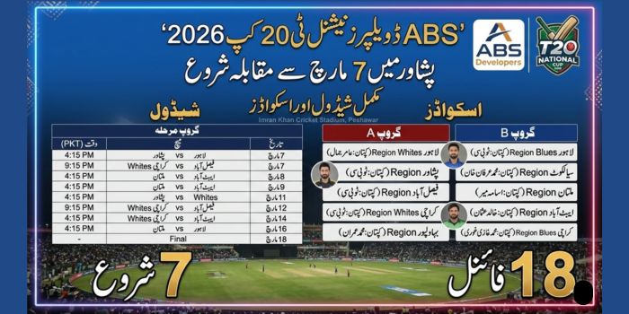 لاہور / پشاور (4 مارچ 2026) – پاکستان کرکٹ بورڈ (PCB) نے ABS ڈویلپرز نیشنل ٹی 20 کپ 2026 کے شیڈول کا اعلان کر دیا ہے۔ ٹورنامنٹ کا آغاز 7 مارچ سے ہوگا، جبکہ سیمی فائنلز 17 مارچ اور فائنل 18 مارچ کو کھیلا جائے گا۔